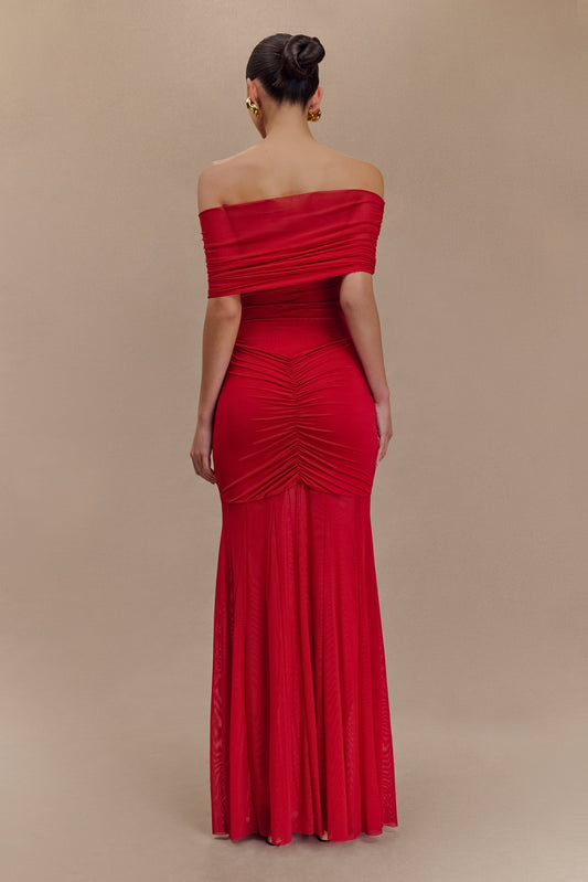 Caspian Slinky And Mesh Off Shoulder Maxi Dress - Ruby