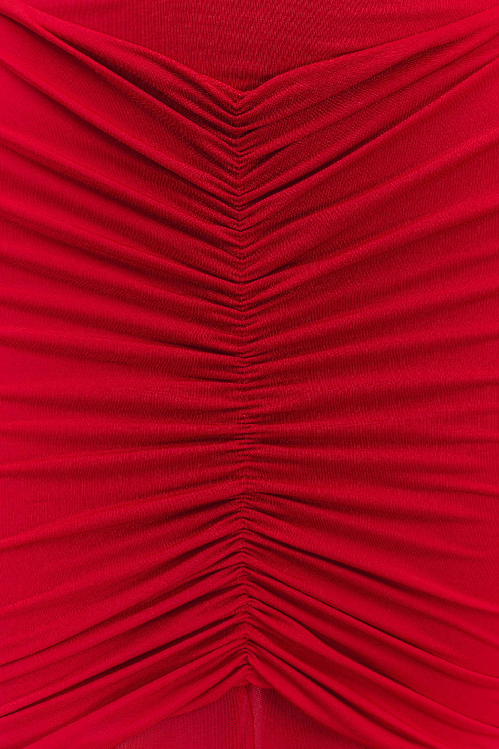 Mesh Overlay: Elegant off-shoulder style with dramatic appeal.
