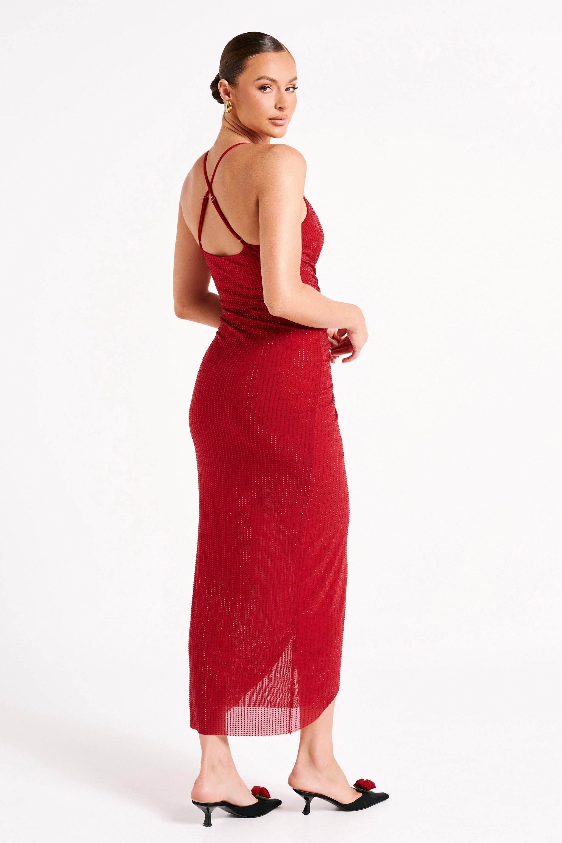 Radiate elegance and glamour with the EMERAUDE Diamante Mesh Midi Dress, a dazzling statement piece perfect for your next soirée. Embellished with sparkling diamantes on a lightweight mesh base, this dress highlights your silhouette with a plunging V-neckline, cinched ruching detail, and a chic cross-back design. Designed with adjustable straps and a lined interior, it offers both style and comfort for a stunningly polished look.