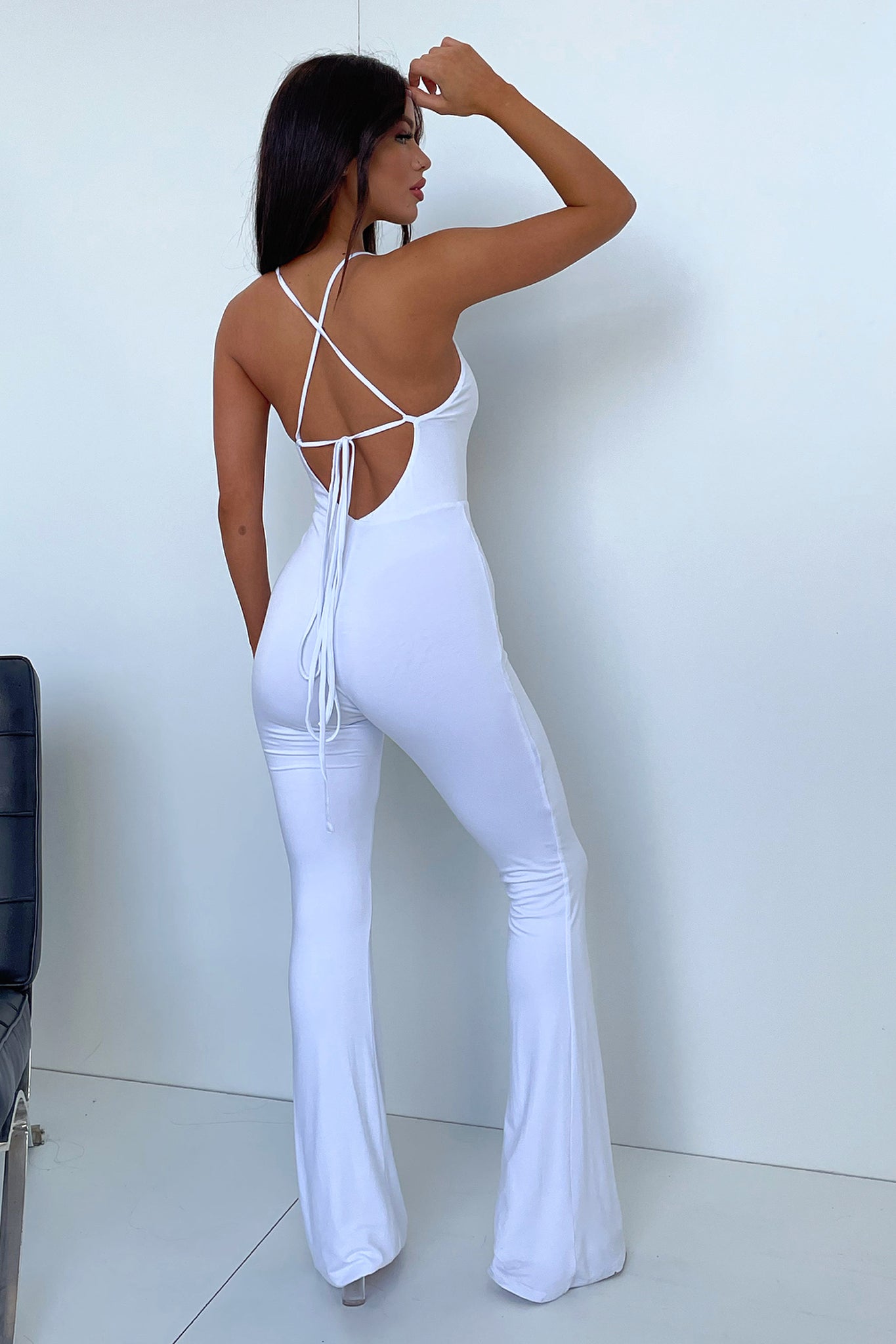 About to hit up the town in the absolute baddie! The Saffron Jumpsuit is a total babe featuring a bodycon fit with flared bottoms, a soft double lined material, a plunging v-shaped neckline, tie up shoulder straps and a backless cut. Styler her with black stilettos and a red hot lip.