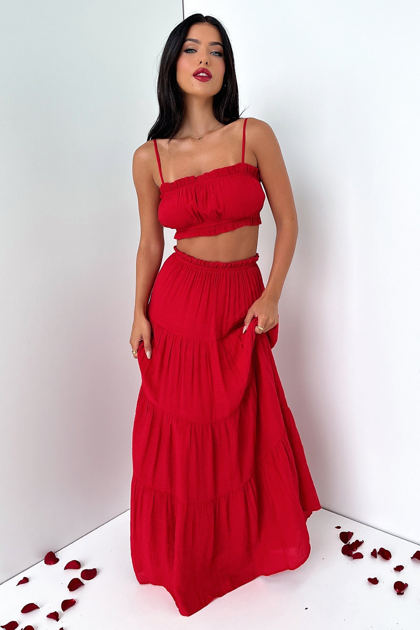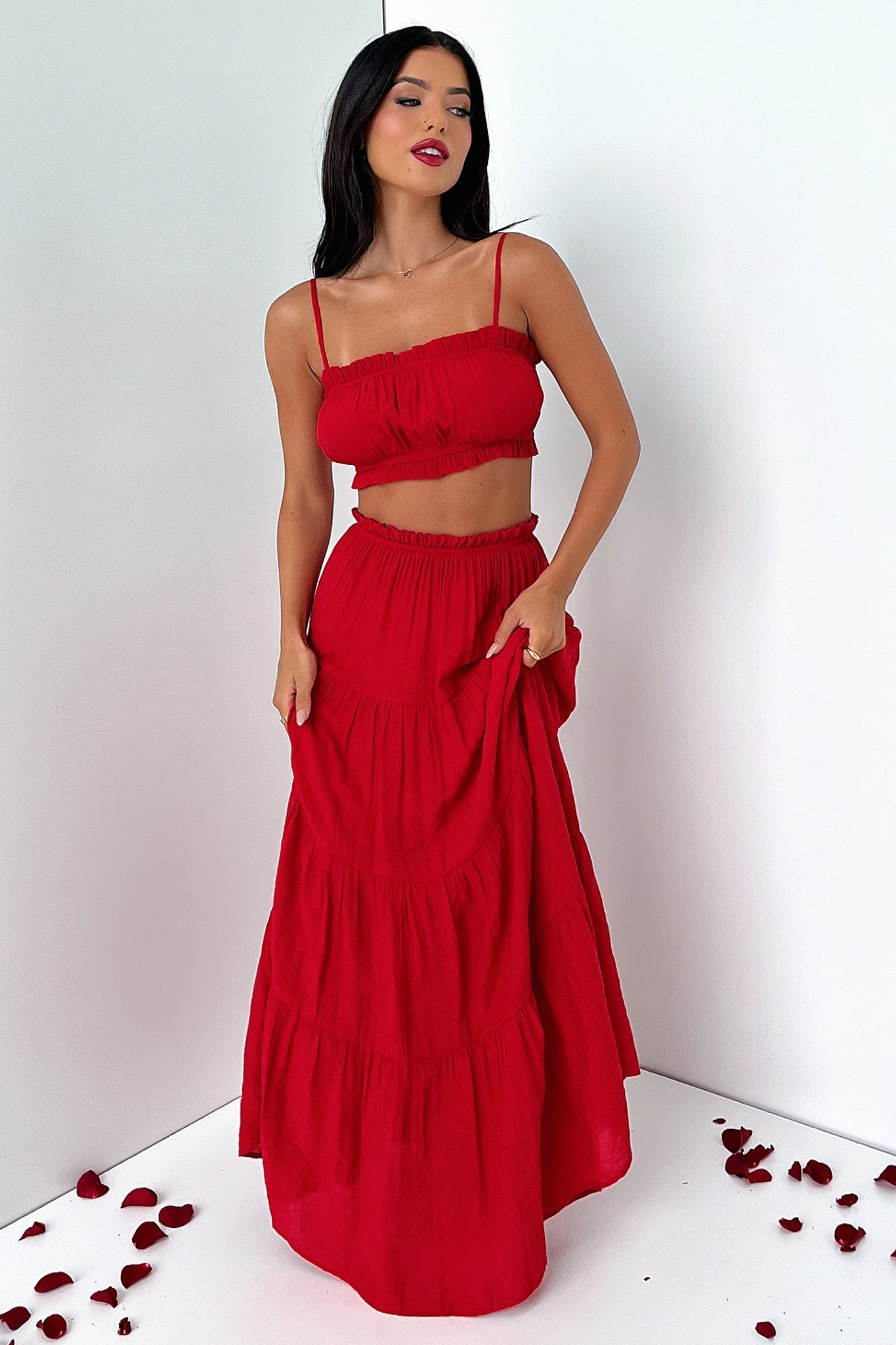 Summer vibing in the Selina Set! This gorg maxi skirt features an elasticated waistband with frilled edges, a flowy fitting skirt and double lined material. Style her with the matching crop and a pair of White Sandals.